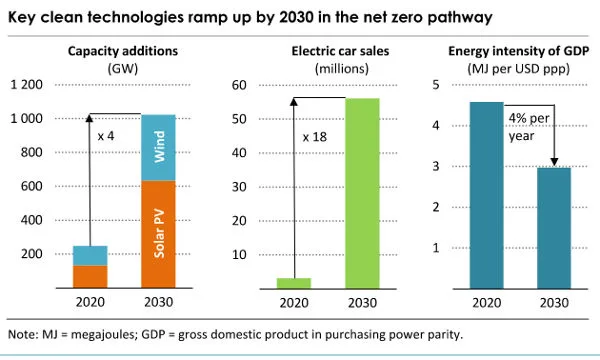 Il solare diventerà la più grande fonte di approvvigionamento energetico totale del mondo. I combustibili fossili scenderanno da quasi quattro quinti della fornitura totale di energia, di oggi, a poco più di un quinto. Questi saranno usati, per lo più, per produrre beni in cui il carbonio è incorporato nel prodotto, come la plastica, in impianti dotati di cattura del carbonio ed in settori in cui le opzioni tecnologiche a basse emissioni sono ridotte.