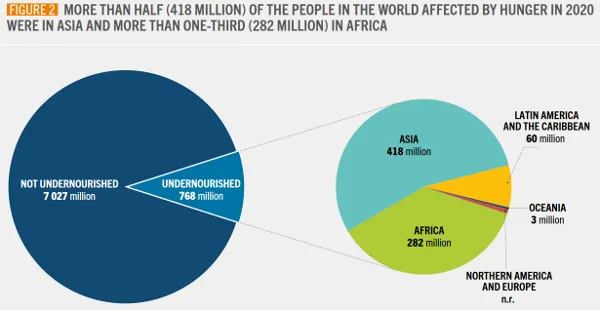 Più della metà di tutte le persone denutrite (418 milioni) vive in Asia; più di un terzo (282 milioni) in Africa e una percentuale minore (60 milioni) in America Latina e nei Caraibi. “L’aumento più marcato della fame – secondo SOFI – si è verificato in Africa, dove la prevalenza stimata della denutrizione – al 21% della popolazione – è più del doppio di quella di qualsiasi altra regione".