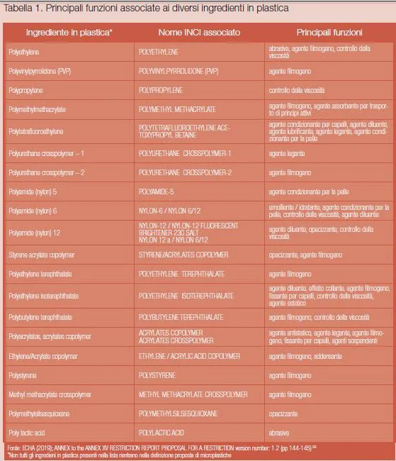 Delle dieci materie plastiche più frequenti individuate durante la presente indagine (PVP, Polyethylene, Polybutene, Trimethylsiloxysilicate, Nylon 12, Acrylates copolymer, Polymethyl metha-crylate, Vinyl dimethicone/methicone silsesquioxane crosspolymer, Polymethylsilsesquioxane, Methyl methacrylate crosspolymer) solo per tre solo disponibili informazioni, l’ECHA le classifica come pericolose, si tratta del