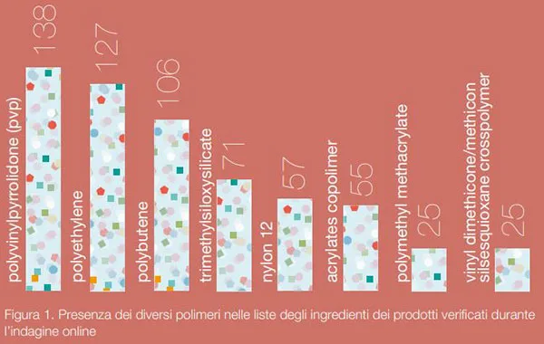 Dei 672 prodotti presi in esame nell’indagine online, il 79% aveva almeno un ingrediente in plastica e circa il 38% di questi presentava ingredienti in plastica solida (microplastiche) mentre nei restanti le materie plastiche erano in forma liquida, semisolida o solubile. Degli 11 marchi presi in esame, solo in uno non è emersa la presenza di ingredienti in plastica.