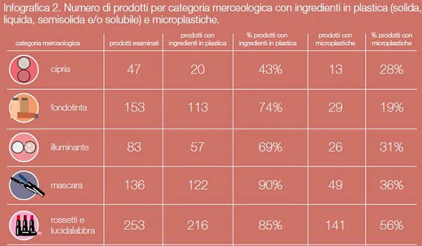 I mascara sono i prodotti in cui la presenza di ingredienti in plastica è risultata maggiore, 90%, seguiti da rossetti e lucidalabbra 85%, fondotinta 74%, illuminanti 69% e ciprie 43% (Infografica 2).