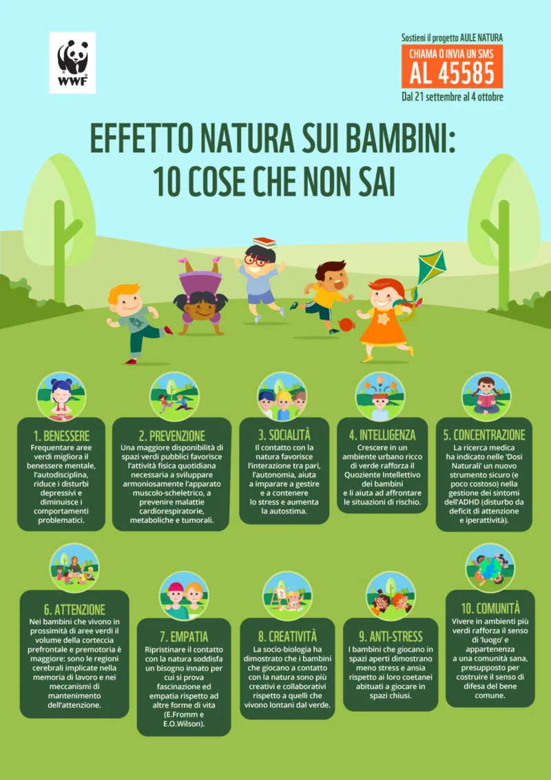 wwf-infografica-10-cose-effetto-natura.jpgMa perché la vita all’aperto, a contatto con la natura, aiuterebbe il benessere dei bambini anche e soprattutto nelle nostre città? La risposta, che WWF ci riassume nel suo decalogo “10 cose che non sai”, ovvero i benefici della natura sui bambini (vedi infografica a fianco che è possibile  ingrandire), ci giunge da numerosi studi e sperimentazioni, come quella svolta in Inghilterra e raccontata nel report di Wildlife Trust Children and Nature: dopo aver trascorso del tempo in ambiente naturale, il 90% dei bambini partecipanti allo studio ha detto di aver imparato qualcosa di nuovo sulla natura, l’84% si ritiene capace di cose nuove, il 79% si è sentito più sicuro di sé. Ecco perché secondo Wildlife Trust, i bambini dovrebbero passare almeno un’ora al giorno imparando e giocando nella natura, per migliorare il loro benessere e la loro autostima.