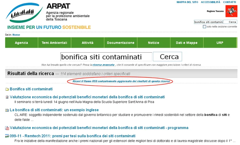 È anche possibile ottenere un flusso RSS "personalizzato" effettuando una ricerca (base o avanzata) tramite il motore interno al sito Web e sottoscrivere poi, tramite l’apposita voce la ricezione del flusso corrispondente ai criteri di ricerca indicati, in modo da essere avvisati quando vengono pubblicati nuovi contenuti su un determinato argomento (ad esempio, la chiave di ricerca "bonifica siti contaminati" produce uno specifico flusso RSS).