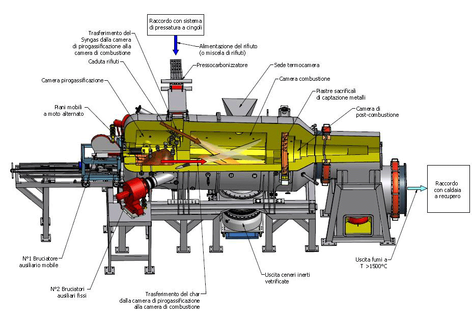 Le tre zone, comunicanti e integrate nella stessa unità, scompongono il processo di combustione del materiale solido trattato nelle sue tre fasi elementari permettendo di gestirle e controllarle in modo autonomo, ottenendo importanti benefici in termini ambientali, che vanno dalla combustione in fase gassosa del syngas, al contenimento delle quantità di aria di combustione, alla omogeneità delle temperature elevate raggiunte, all’assenza di polveri e particolato nei fumi. Nell’immagine è riportato il dettaglio costruttivo dell’unità di pirogassificazione.