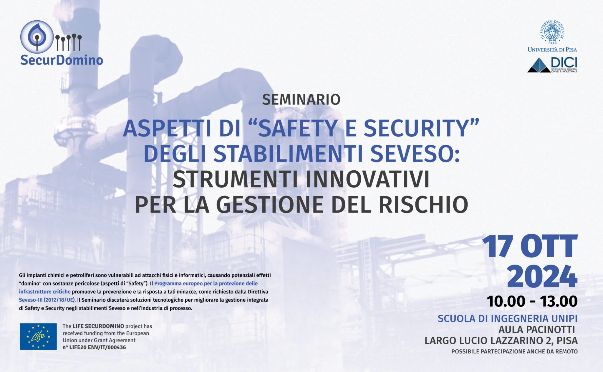 Gli impianti chimici e petroliferi sono vulnerabili ad attacchi fisici e informatici, causando potenziali effetti domino con sostanze pericolose (aspetti di "safety"). Il Programma europeo per la protezione delle infrastrutture critiche promuove la prevenzione e la risposta a tali minacce, come richiesto dalla Direttiva Seveso-III (2012/18/UE). Il seminario discuterà soluzioni tecnologiche per migliorare la gestione integrata di safety e security negli stabilimenti Seveso e nell’industria di processo.