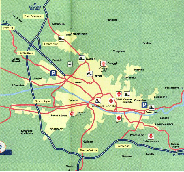 L’autostrada Milano – Napoli descrive intorno a Firenze un arco di circonferenza da N a E intersecato da viabilità radiali tra cui la Firenze-Pisa Nord, la Firenze-Pisa-Livorno, la Firenze-Siena e il raccordo che collega l’uscita di Firenze Sud alla zona di Varlungo.