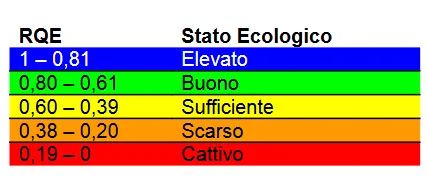 Il valore di M-AMBI risultante varia tra 0 e 1 e corrisponde al Rapporto di Qualità Ecologica (RQE) richiesto dalla normativa. L’RQE è suddiviso in 5 classi, che corrispondono ad altrettante classi di Stato Ecologico, ai sensi della Direttiva sulle acque. I valori di riferimento per ciascun parametro (AMBI, H’ e S) che compone l’indice M-AMBI e i relativi limiti fra le classi Buono/Sufficiente ed Elevato/Buono sono definiti nel D.M. 260/2010.